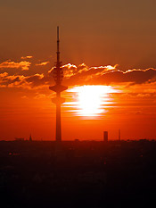 Mit der Großstadt auf Du-und-Du: Heinrich-Hertz-Turm im Abendrot.